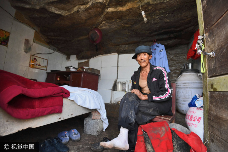 彭兴墙在他的卧室里休息,靠近洞穴的一侧摆放着桌子,屋顶是洞穴天然崖壁。